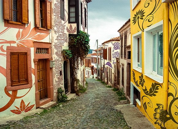 Эта улица с домами, фасады которых украшены художественной росписью, находится на острове Кунда. Это небольшой остров, находящийся в северо-западном Эгейском море (Aegean Sea) у берегов приморского города Айвалыка (Ayvalık), являющегося частью турецкой провинции Балыкесир (Balıkesir).