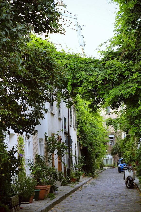Деревья с голыми стволами высажены вплотную к стенам, что позволяет им образовывать балдахин над переулком.