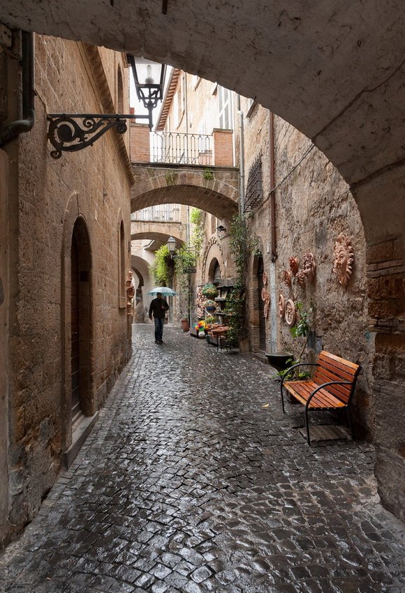 Орвието это город в провинции Терни (Terni), на юго-западе области Умбрия (Umbria), Италия, расположенный на плоской вершине большого холма из вулканического туфа. Вид города является одним из самых прекрасных в Европе. Город возвышается над почти вертикальными поверхностями скал из туфа, и дополнен оборонительными стенами, построенными из того же камня, под названием туф. Этот красивый город полон очаровательных узких улочек, как та, которая изображена на фотографии выше.