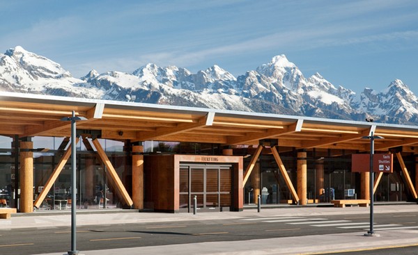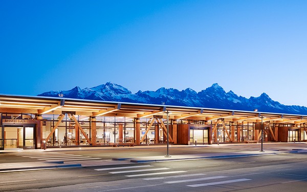 Новый терминал аэропорта города Джексон больше похож на огромный деревянный домик-шале, чем на серьезный инфраструктурный объект. Большего сходства им придают панорамные виды на ближайшие горы, которыми можно любоваться через стеклянные стены фасада здания.